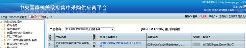 6月1日,中央政府采購網(wǎng)公布了“中央國家機關(guān)2017-2018信息類(lèi)產(chǎn)品協(xié)議供貨采購項目中標公告”,遠望信息計算機終端保密檢查系統、網(wǎng)絡(luò )資產(chǎn)與邊界感知系統、網(wǎng)絡(luò )接入控制系統、計算機敏感信息檢測系統、視頻監控綜合運維報警系統等6款產(chǎn)品成功入圍采購名錄!
