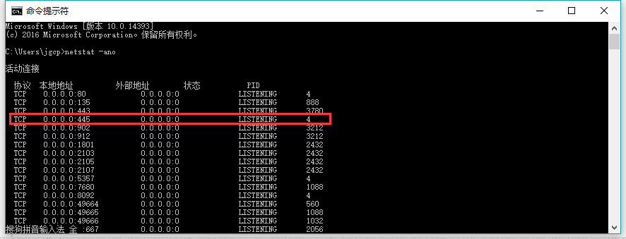 ? ? ? 開(kāi)始---->運行---->cmd,或者是window+R組合鍵,調出命令窗口,輸入命令:netstat -ano,列出所有端口的情況。在列表中我們觀(guān)察開(kāi)放的445端口。