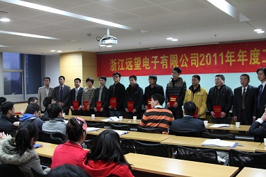 ? 2012年1月17日,浙江遠望電子有限公司2011年年度總結暨表彰大會(huì )隆重召開(kāi),遠望電子公司百余名員工齊聚一堂,共饗盛典。