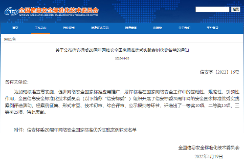 4月19日,全國信息安全標準化技術(shù)委員會(huì )(以下簡(jiǎn)稱(chēng)“信安標委”)20周年網(wǎng)絡(luò )安全國家標準優(yōu)秀實(shí)踐案例獲獎名單公布,由遠望信息與浙江省人力資源和社會(huì )保障信息中心聯(lián)合申報的《專(zhuān)網(wǎng)安全管控體系建設應用》榮獲三等獎。